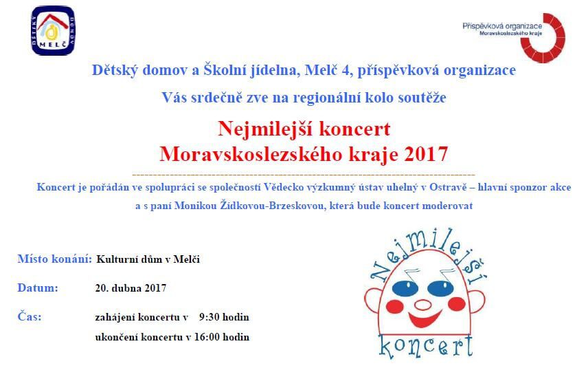 V letošním roce náš dětský domov pořádá regionální kolo Nejmilejšího koncertu 2017 pro Moravskoslezský kraj. Akci zaštiťuje náš sponzor Vědecko-výzkumný ústav uhelný Ostrava a.s. a paní Monika Žídková-Breszková, která bude soutěž moderovat.